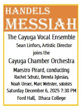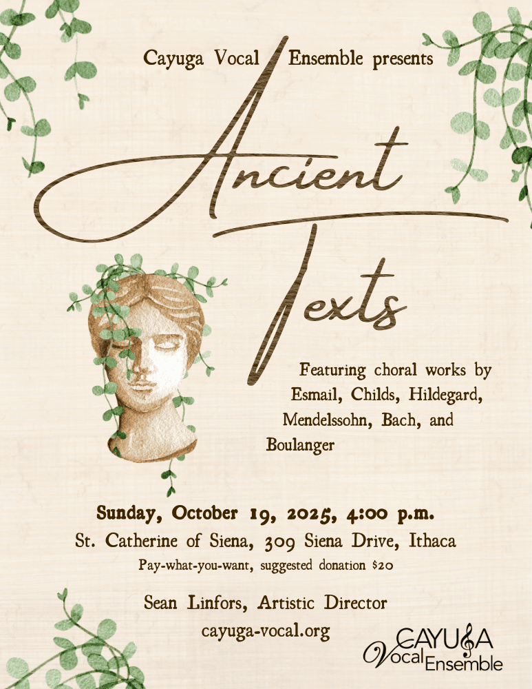 The Cayuga Vocal Ensemble is a twenty-voice choral ensemble of professionally-trained singers, presenting a wide variety of works from a broad spectrum of periods and genres. Our mission is to share our passion for choral music with the Ithaca community and surrounding region through performances that exemplify music’s unique power to touch the human heart and mind.